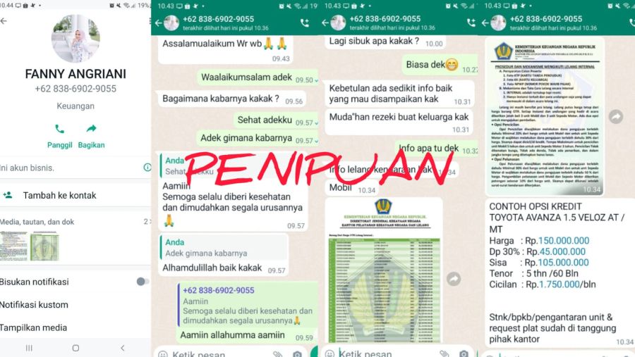 Dalam pesan whatsapp tersebut, penipu mengajak kerjasama untuk pengambilan kendaraan lelang dan mengirimkan brosur prosedur pengambilan lelang dari Kementrian Keuangan Negara Republik Indonesia  Direktorat Jenderal Kekayaan Negara, Kantor Pelayanan Kekayaan Negara Dan Lelang.